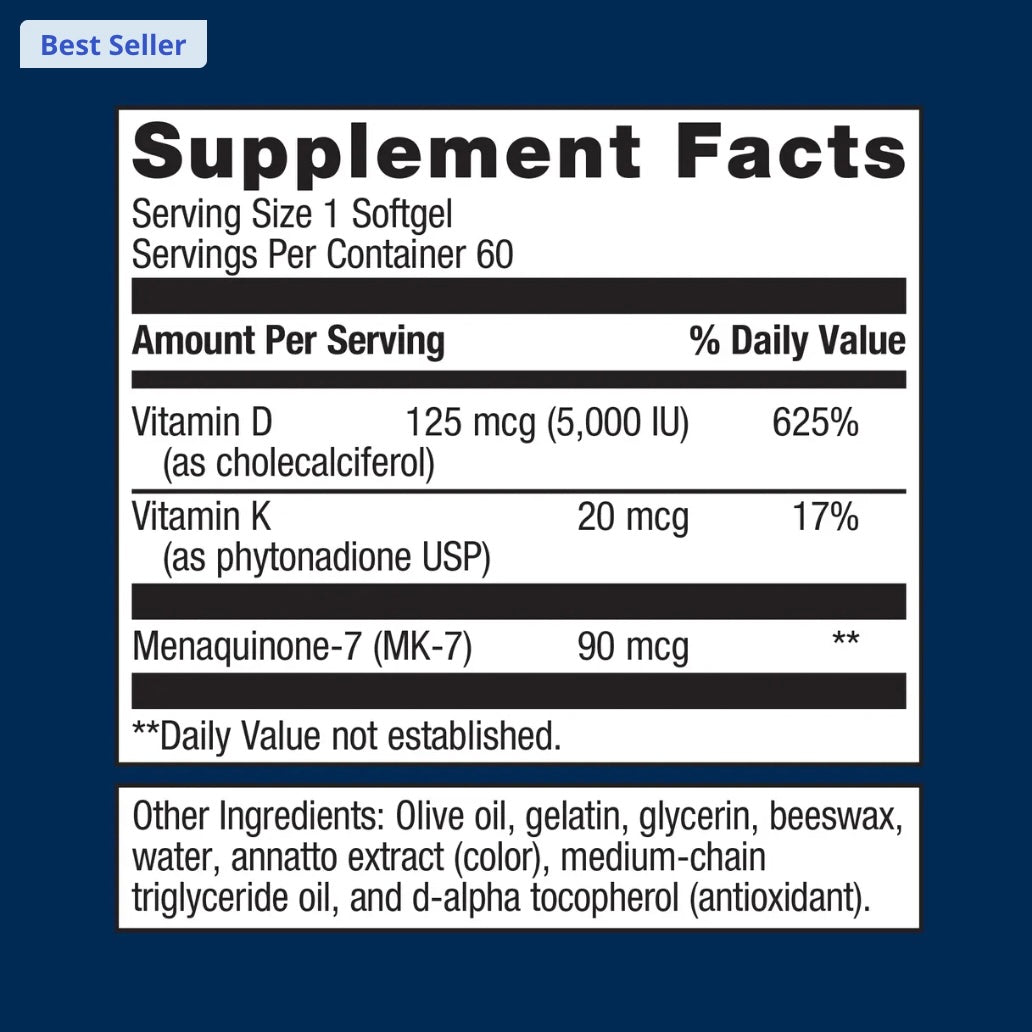 Vitamin D3 + K2 Supplement by Metagenics for Bone, Heart, and Immune Health